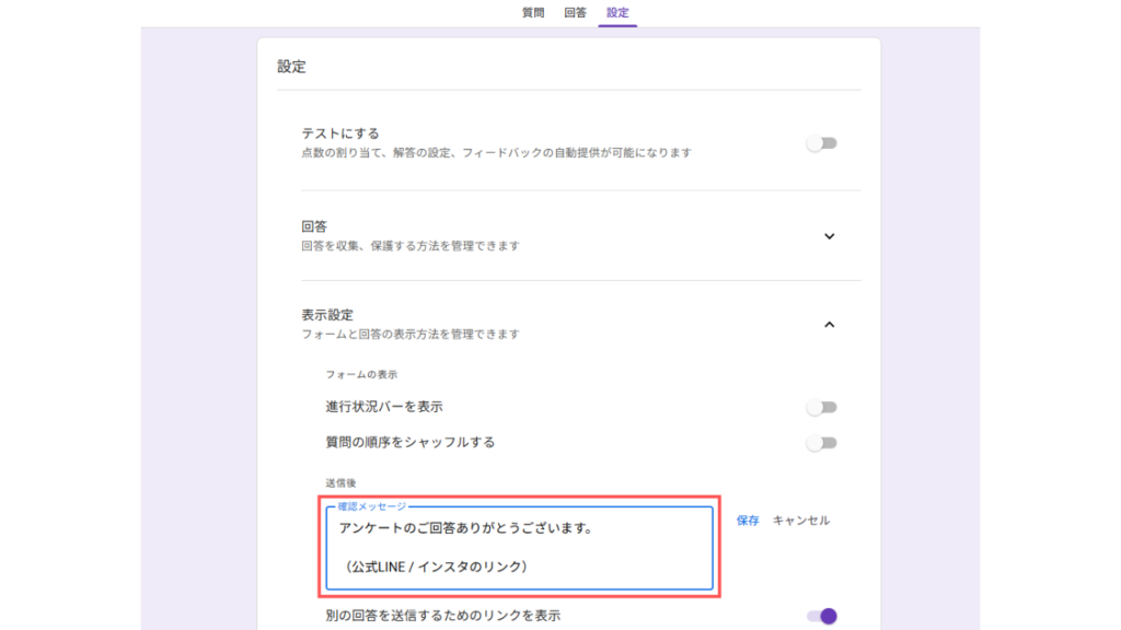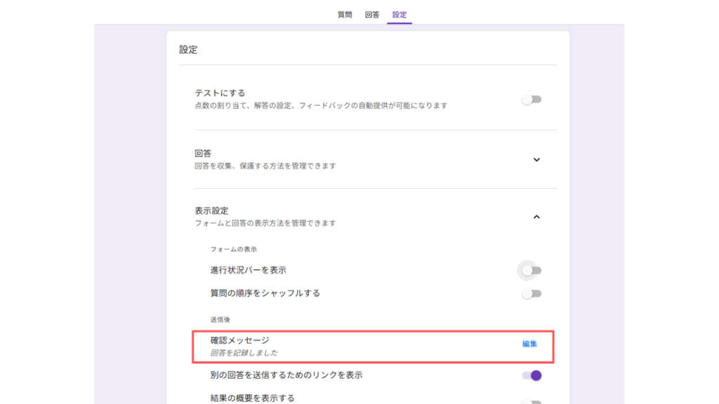 次に、「設定」⇒「送信後」⇒「確認メッセージ」を変更します。