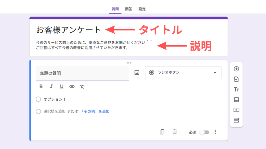 「タイトル」と「アンケートフォームの説明」を入れます。